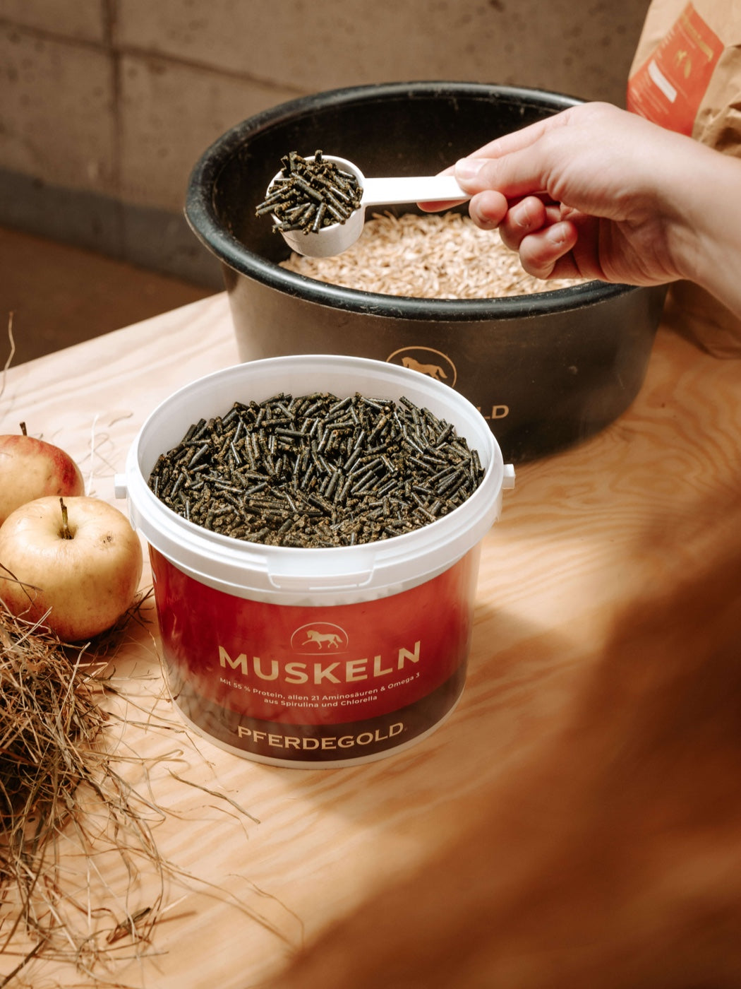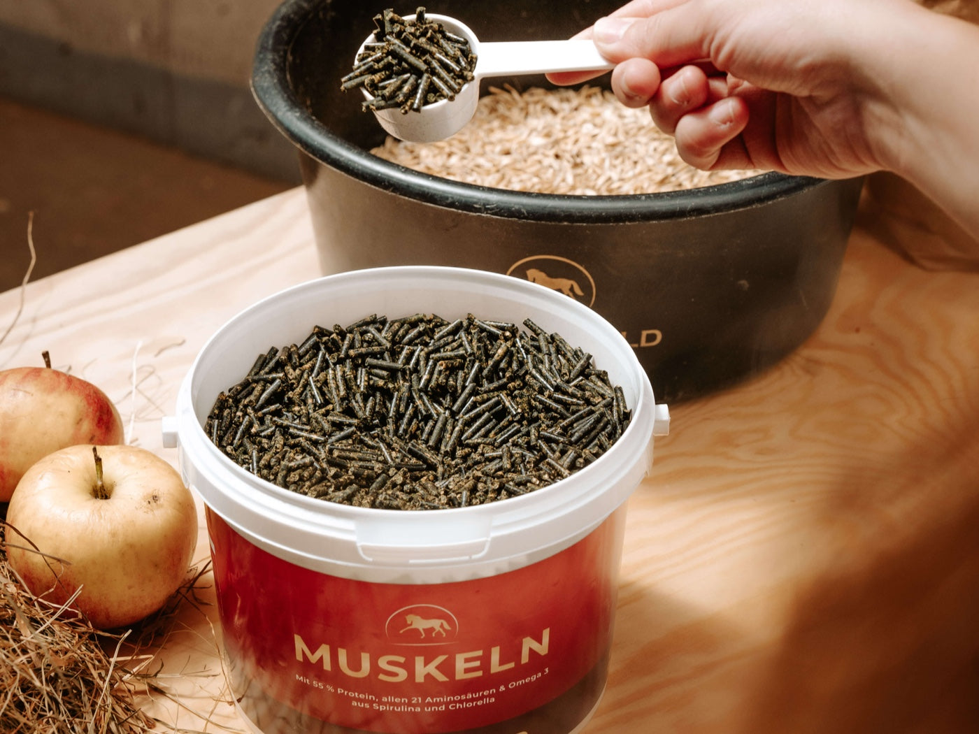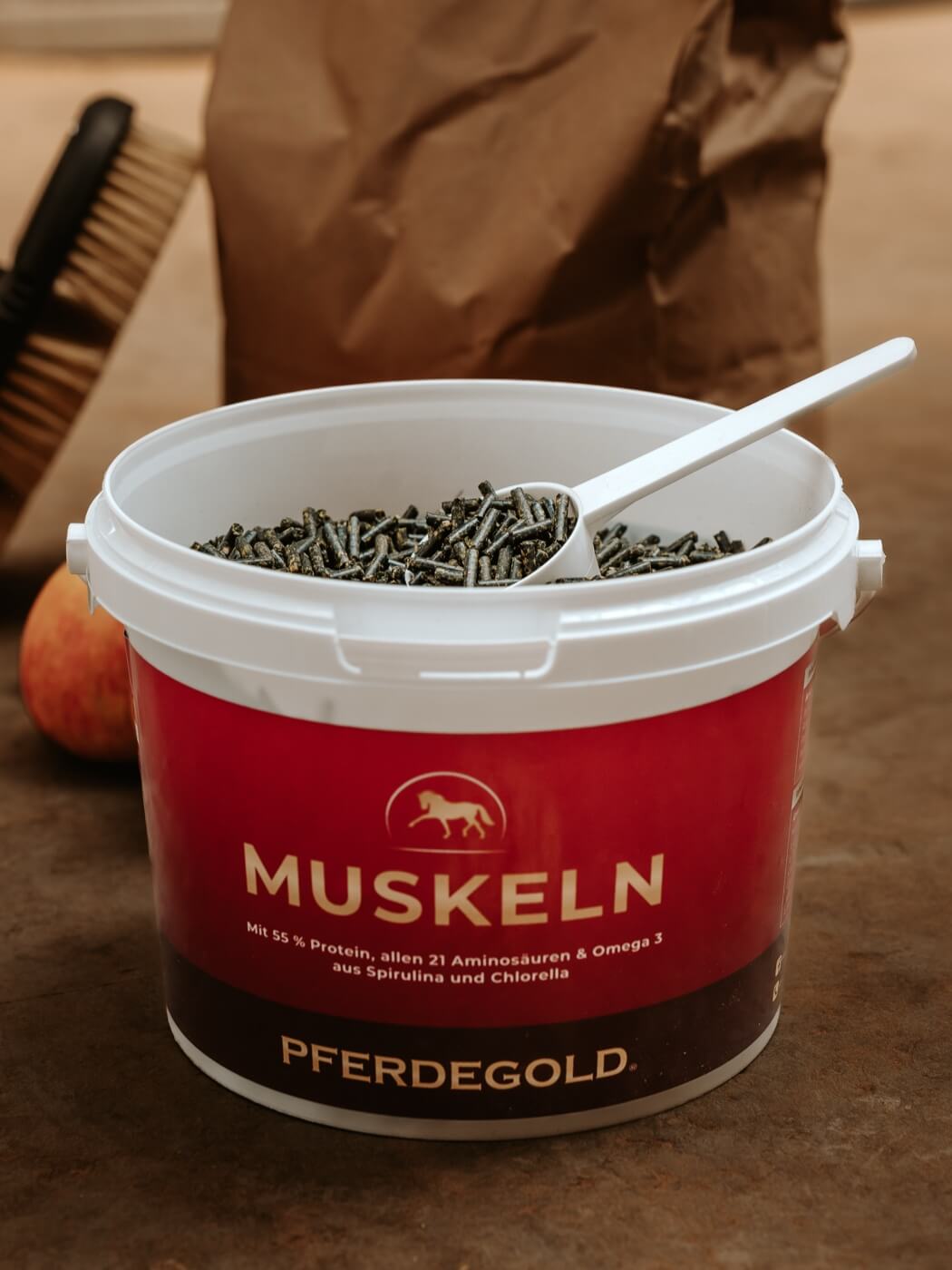 It's best to mix Pferdegold Muskel 2.0 into your regular concentrate feed or some moistened hay. Whether you give it in the morning or evening isn't important – what matters is regular daily administration. However, studies and many customer experiences show that administering it after training can be particularly effective.
