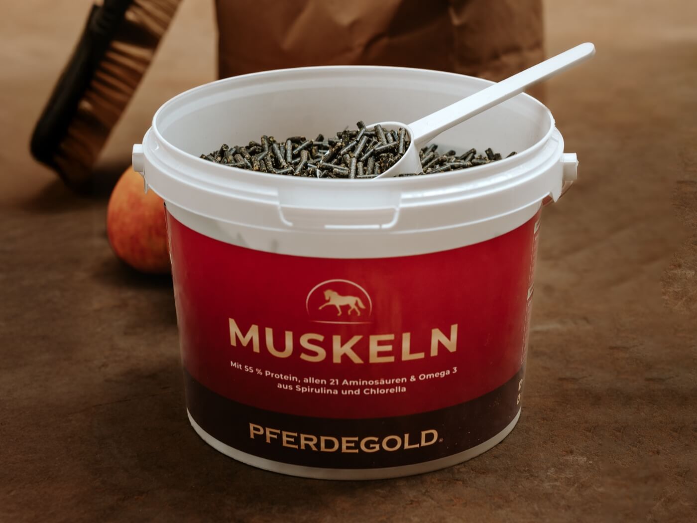 But even completely healthy horses can benefit from optimized nutrition to boost their well-being. Pferdegold Muskel is therefore not only intended for horses with visible muscle loss or after extended breaks in training, but can also be used to generally support nutrient levels.