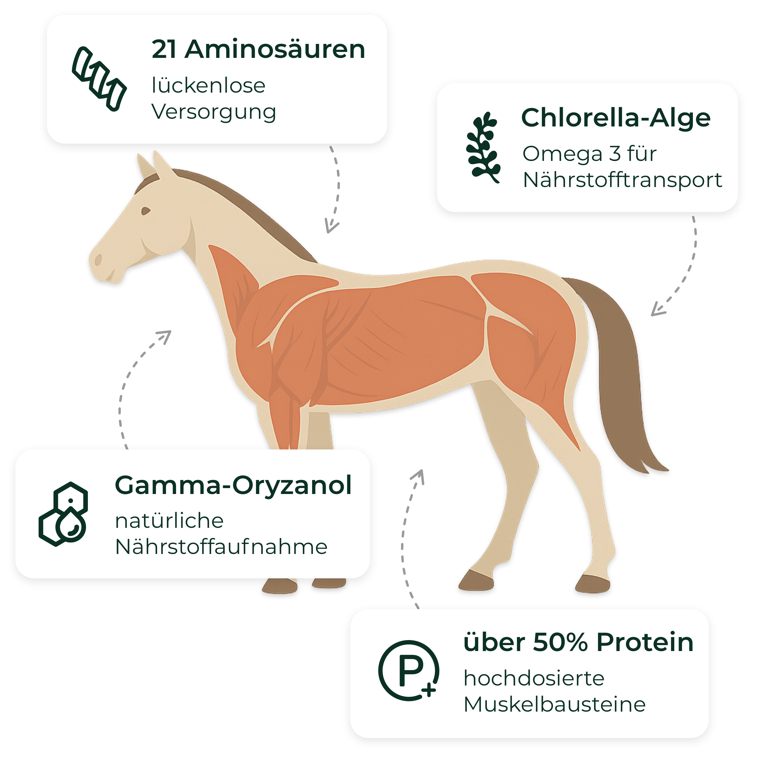 Many horse owners wanted a sugar-free alternative. Instead of molasses, we now use the even higher-quality chlorella algae, which also provides natural amino acids and omega-3 fatty acids.