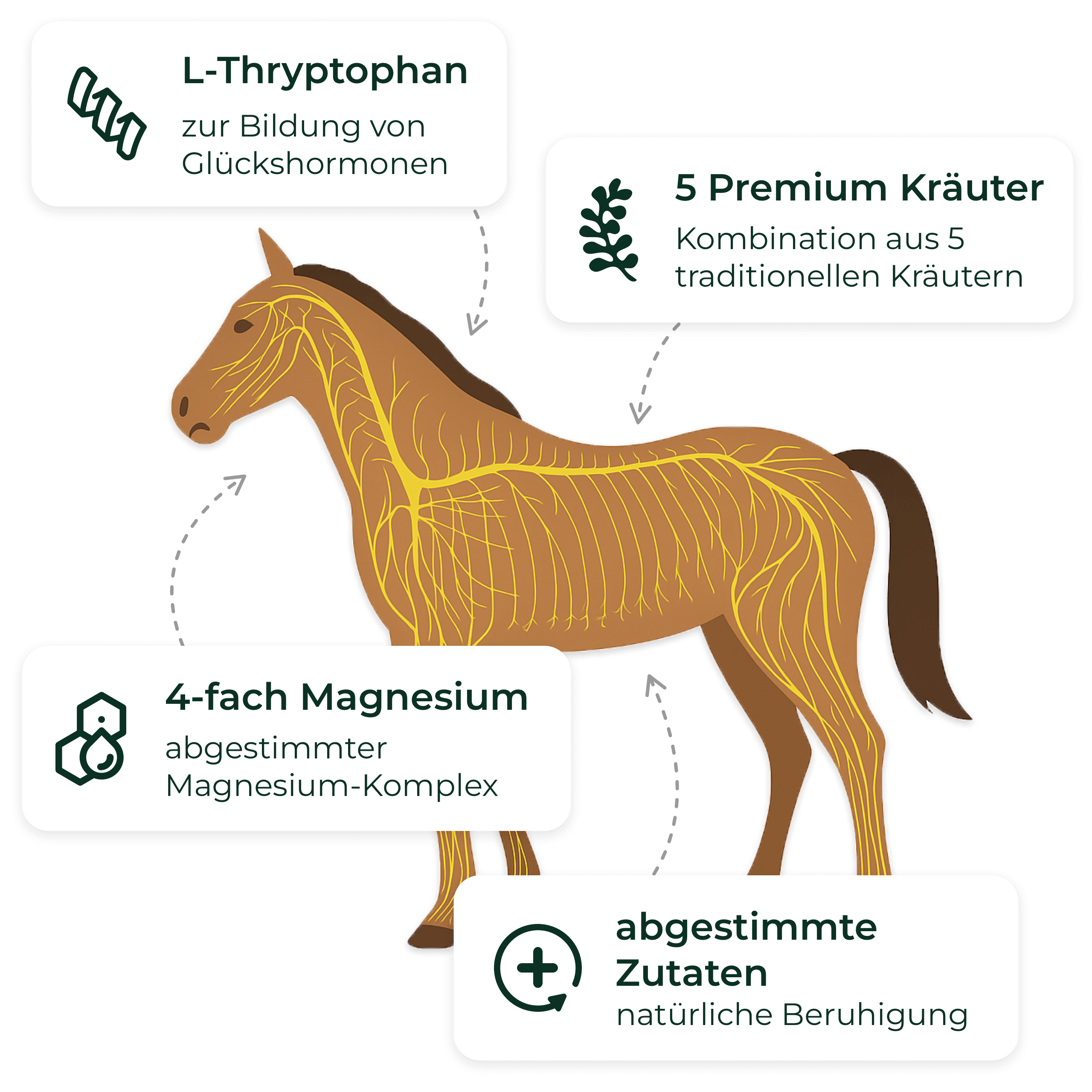 Bewährtes Magnesium, traditionelle Kräuter und moderne Erkenntnisse zu L-Tryptophan. Die einzigartige Formel unterstützt Pferde dabei, ihre natürliche Gelassenheit zu finden und zu bewahren.